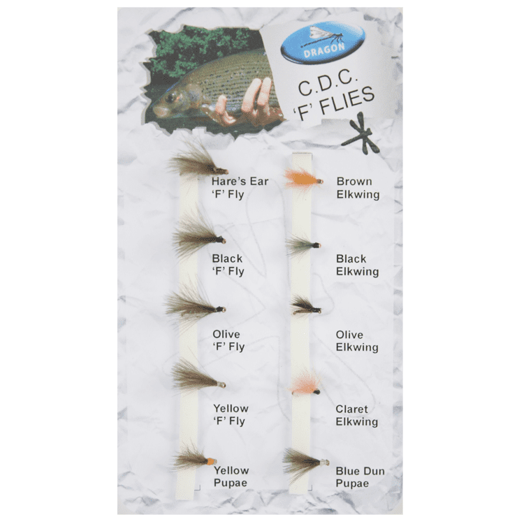 The Dragon CDC 'F' Flies Selection contains 10 favourite patterns. The 'F' Fly design has become increasingly popular as an emerger pattern, and seems to work equally well on rivers or stillwaters. The natural buoyancy of the CDC helps the fly to hang in the surface film.
